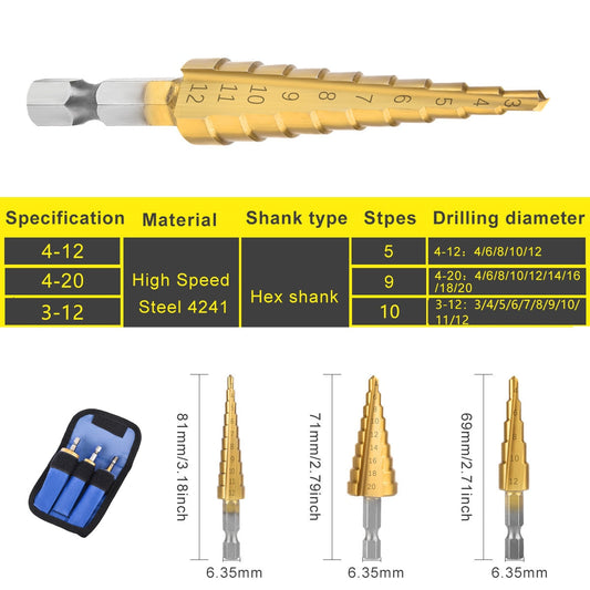 3Pcs/set 3-12mm 4-12mm 4-20mm HSS Straight Groove Step Drill Bit Titanium Coated Wood Metal Hole Cutter Core Drilling Tools Set